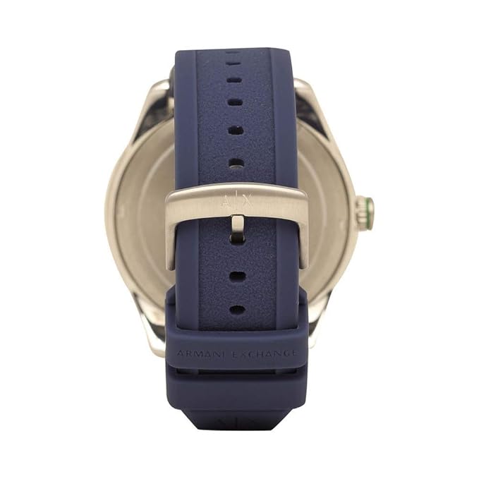 A watch made to exert your power with style, this men's analog watch from the House of Armani Exchange is a must have for every influential man out there. The newcomer Enzo takes a turn for the sophisticated, incorporating a rich blue silicone strap with tachymeter on it's top ring to make it more intriguing. Also, features a sleek stainless steel case and a blue analoge dial with three hand movement and silver lum stick markings at all hours to give the final touch. This watch is perfect for any formal or casual event.