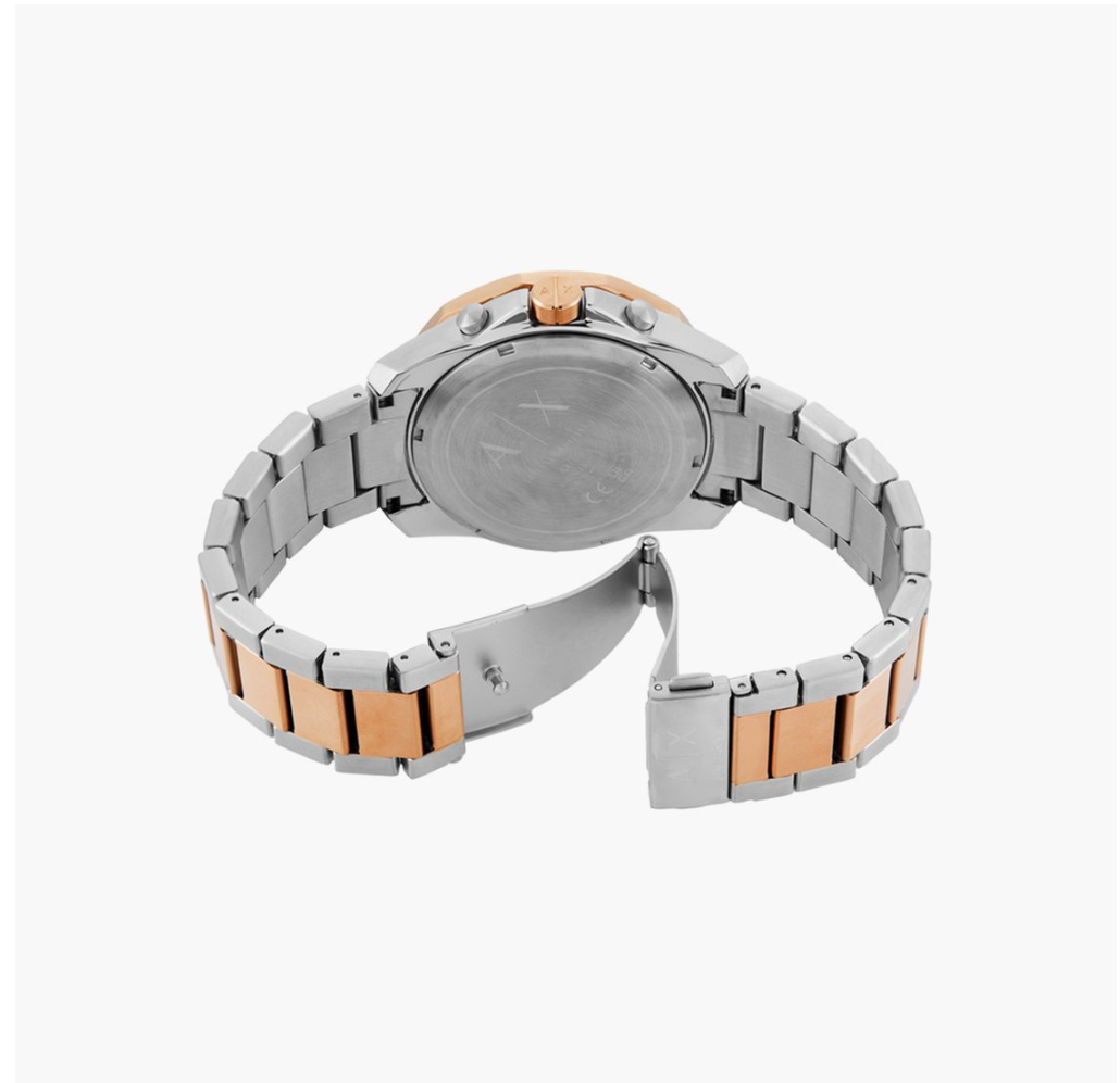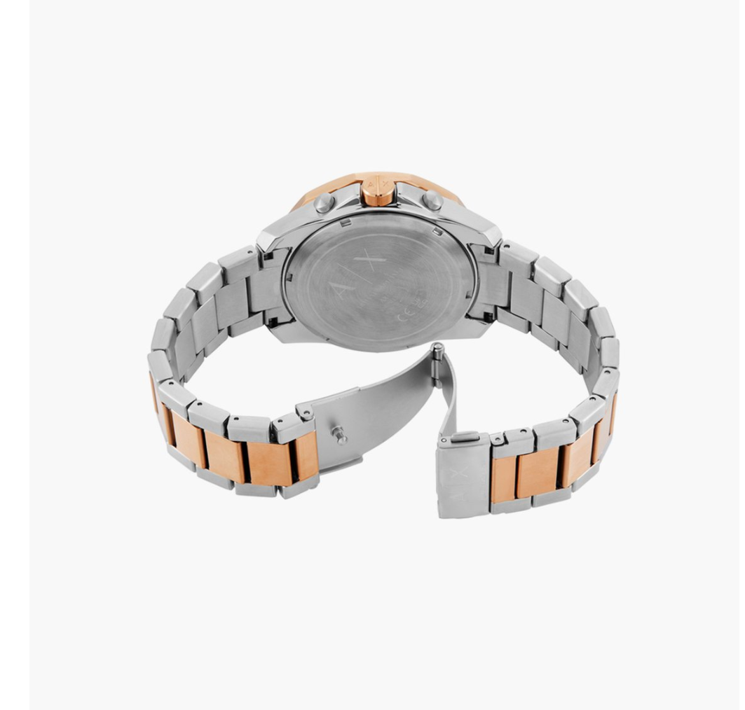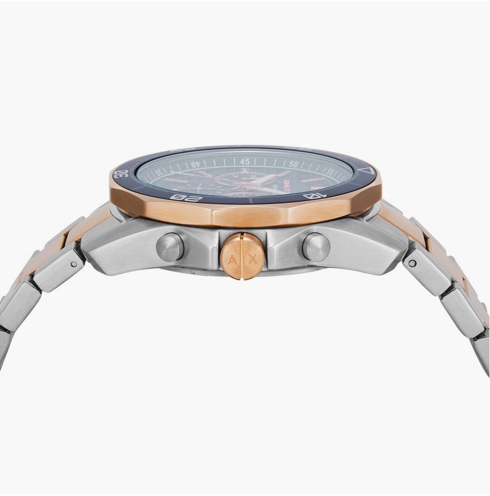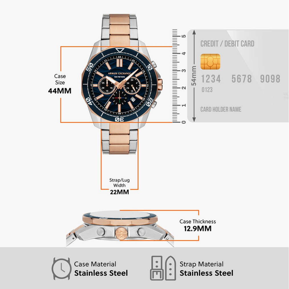 Armani Exchange's 44mm watch features a blue textured dial, chronograph movement and two-tone rose gold and stainless-steel bracelet. If you are looking for a refined look. Known for its distinctive pattern, this timepiece stands out. With a stunning design and charming looks, this is an exquisite wristwatch made for Everyone.