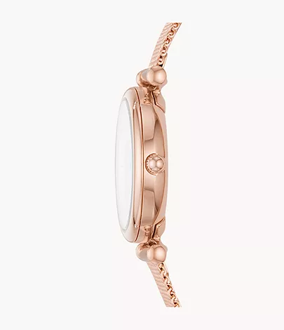 This 28mm Carlie Mini features a mother-of-pearl dial with Roman numerals, three-hand movement and stainless steel rose gold-tone mesh bracelet.