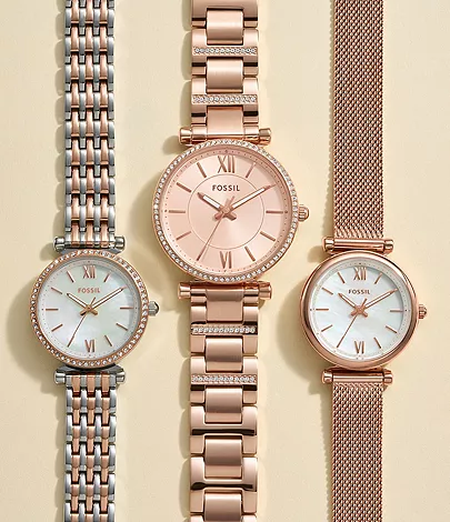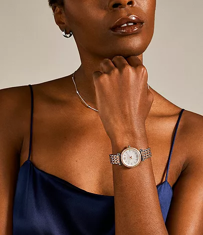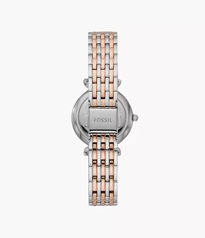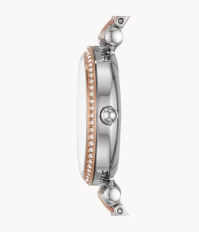 This 28mm Carlie Mini features a mother-of-pearl dial with a glitz bezel, three-hand movement and a two-tone stainless steel bracelet.