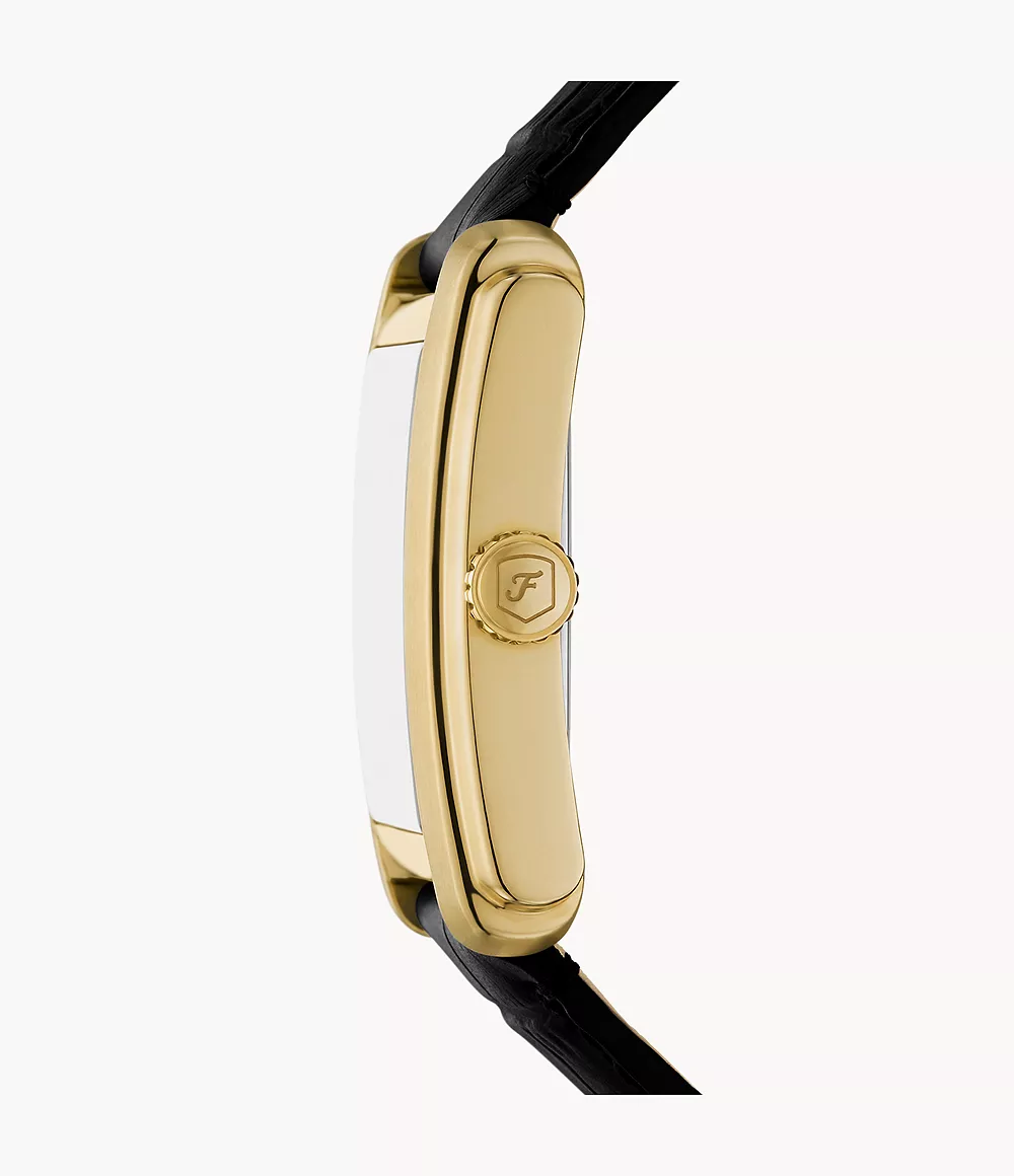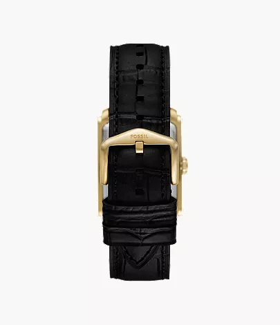 This 30mm Carraway features a black sunray dial, three-hand movement and black croco leather strap. Fossil leather products support responsible manufacturing via the Leather Working Group.