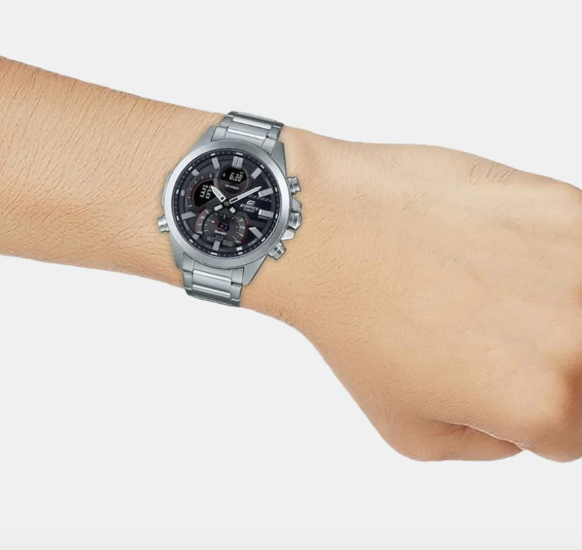 Discover Casio watch for men, featuring a black dial, a silver strap