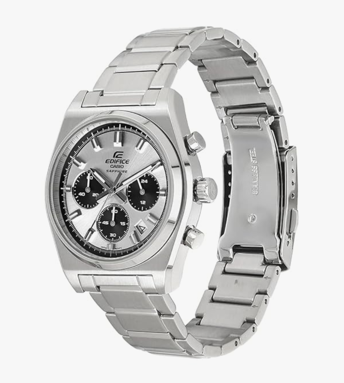 chronograph . The stainless steel strap flaunts a silver hue that