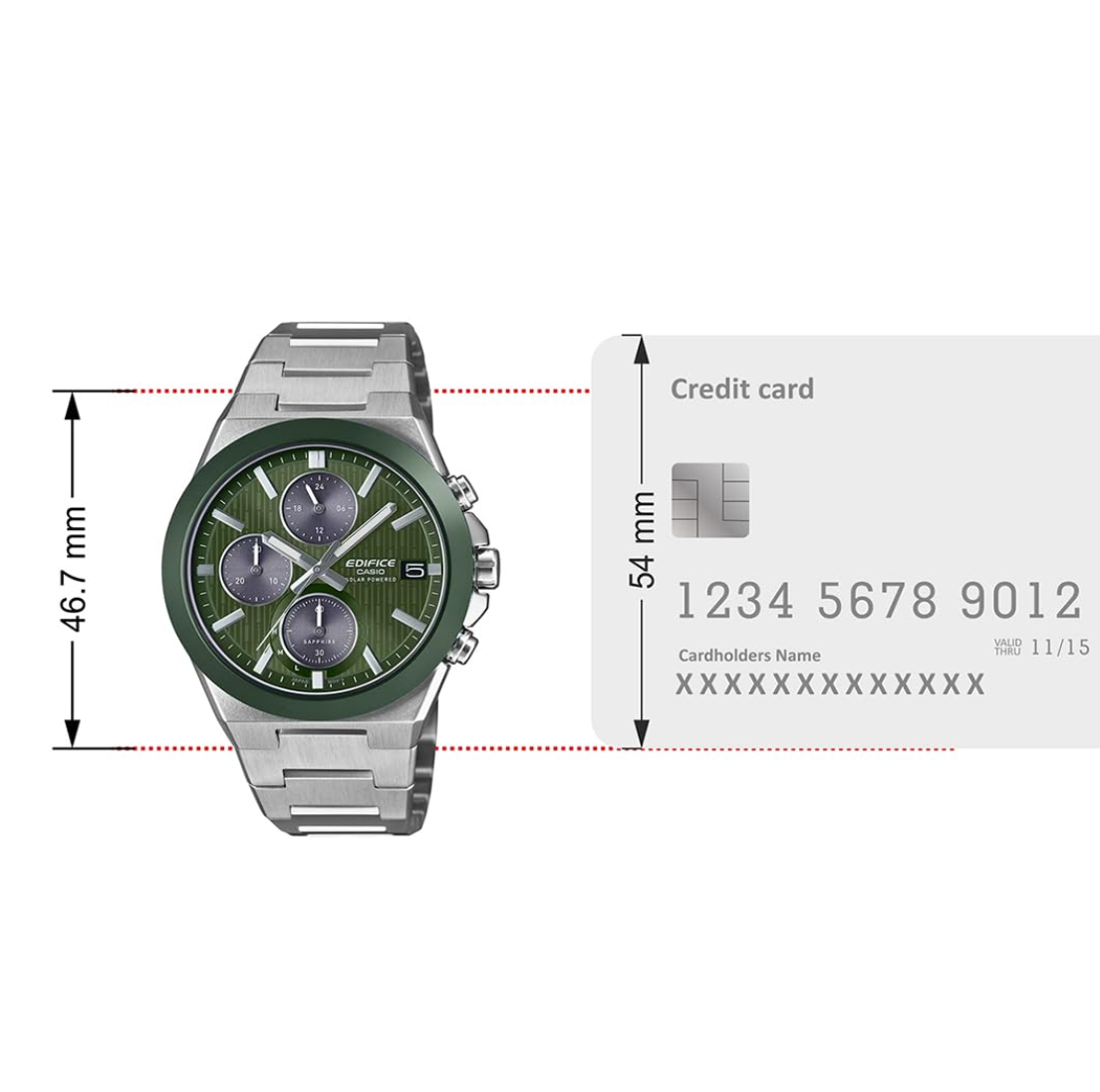 The sapphire crystal ensures visibility and scratch resistance. Solar powered to ensure long battery life and equipped with stopwatch and 100-meter water resistance.