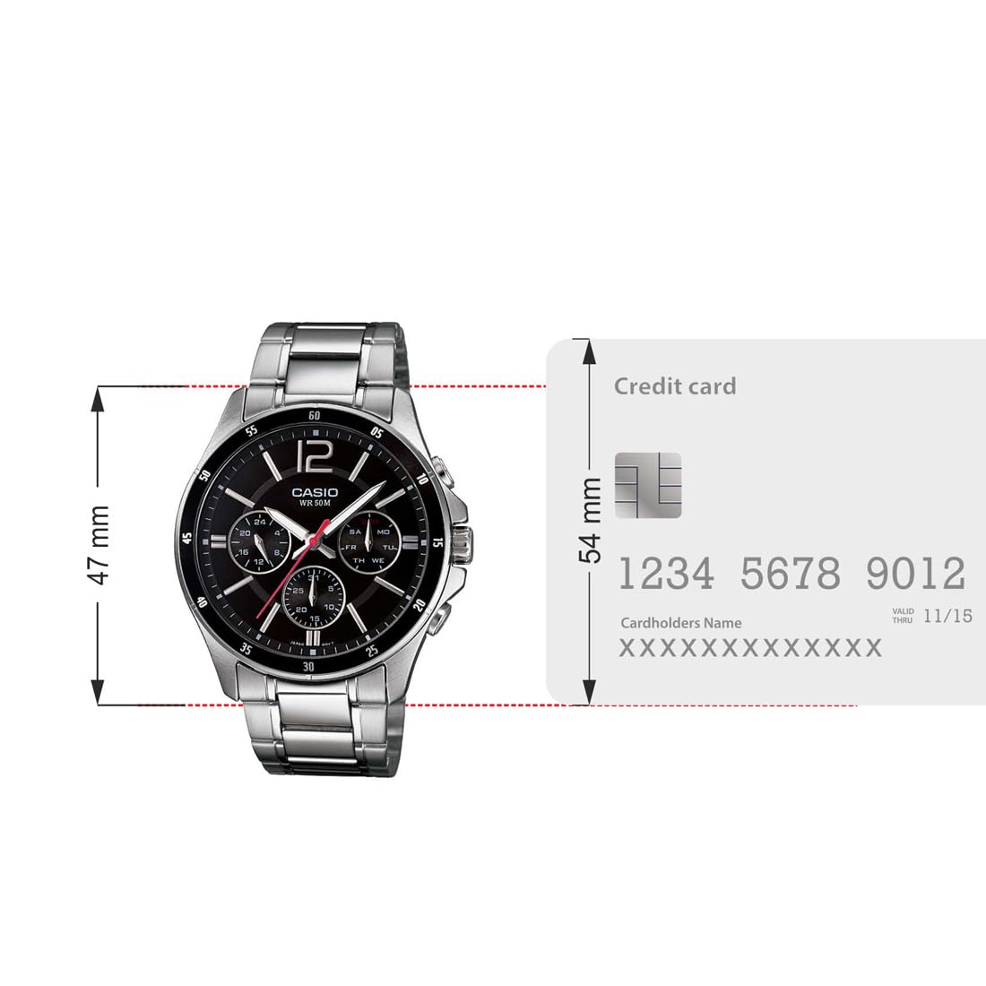 Case style: Analogue watch with a circular stainless steel case, fixed bezel with markings