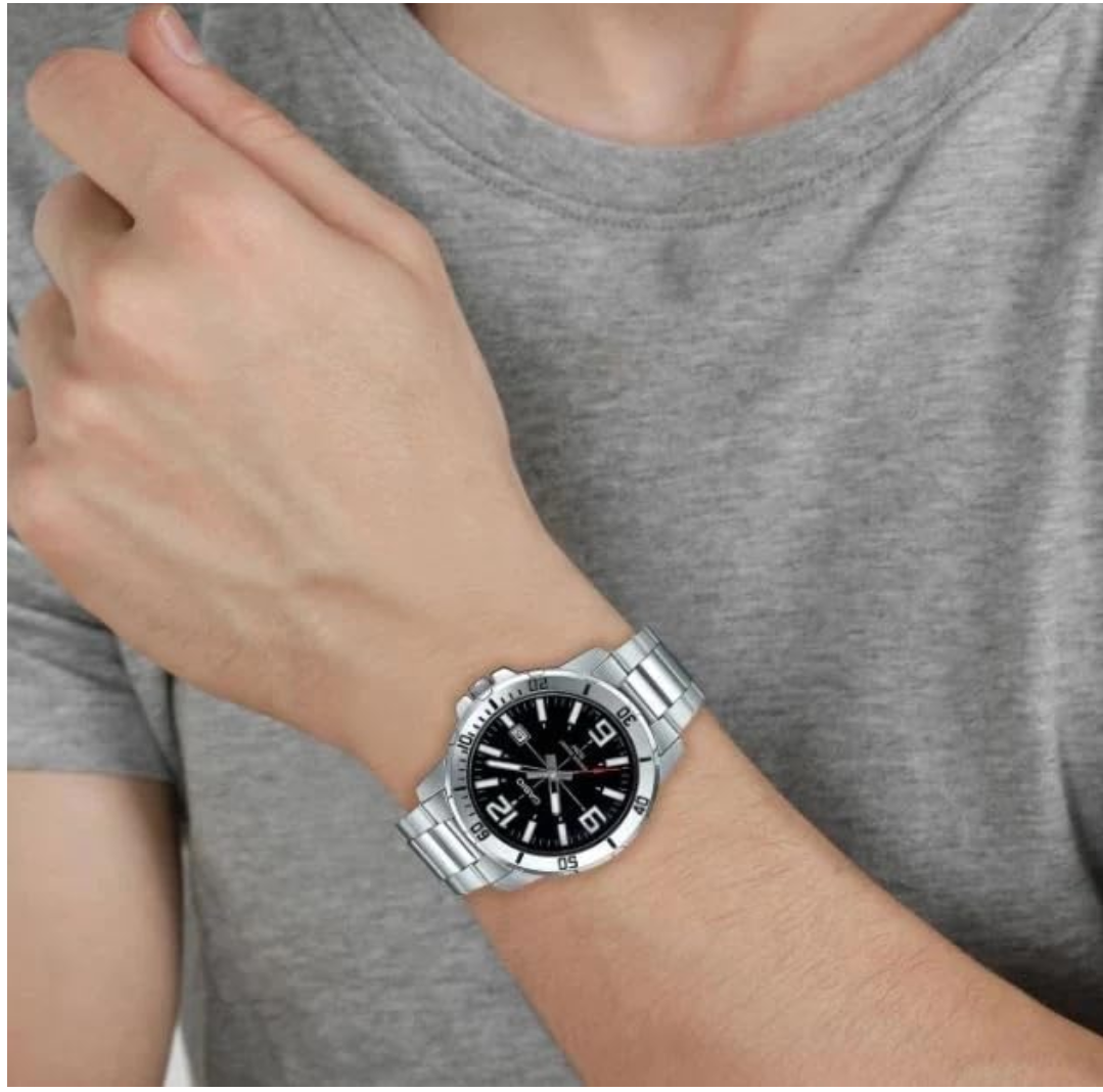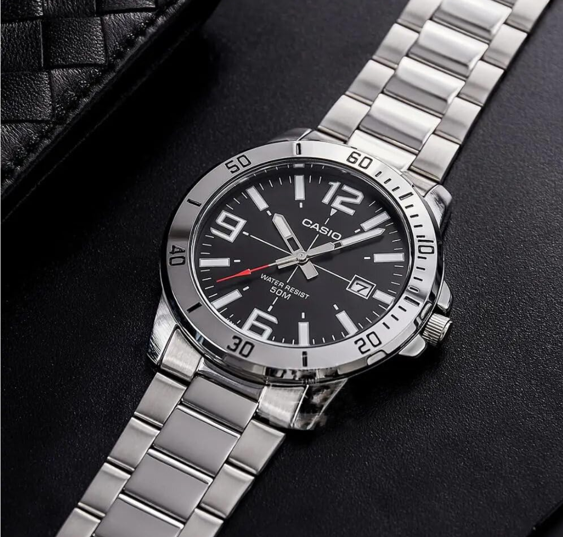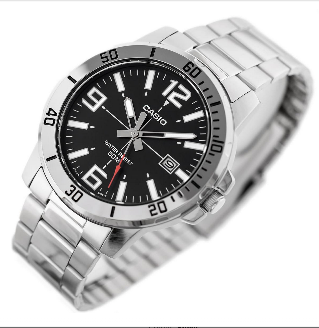 Discover Casio watch for men, featuring a black dial, a silver strap
