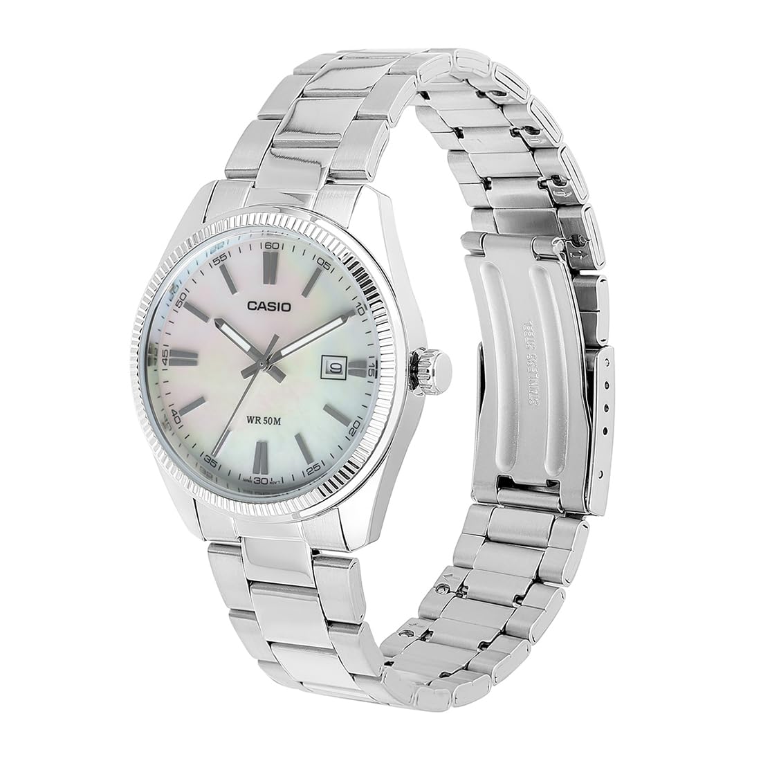 A men's analog watch featuring a stainless steel strap, a round dial, and water resistance.