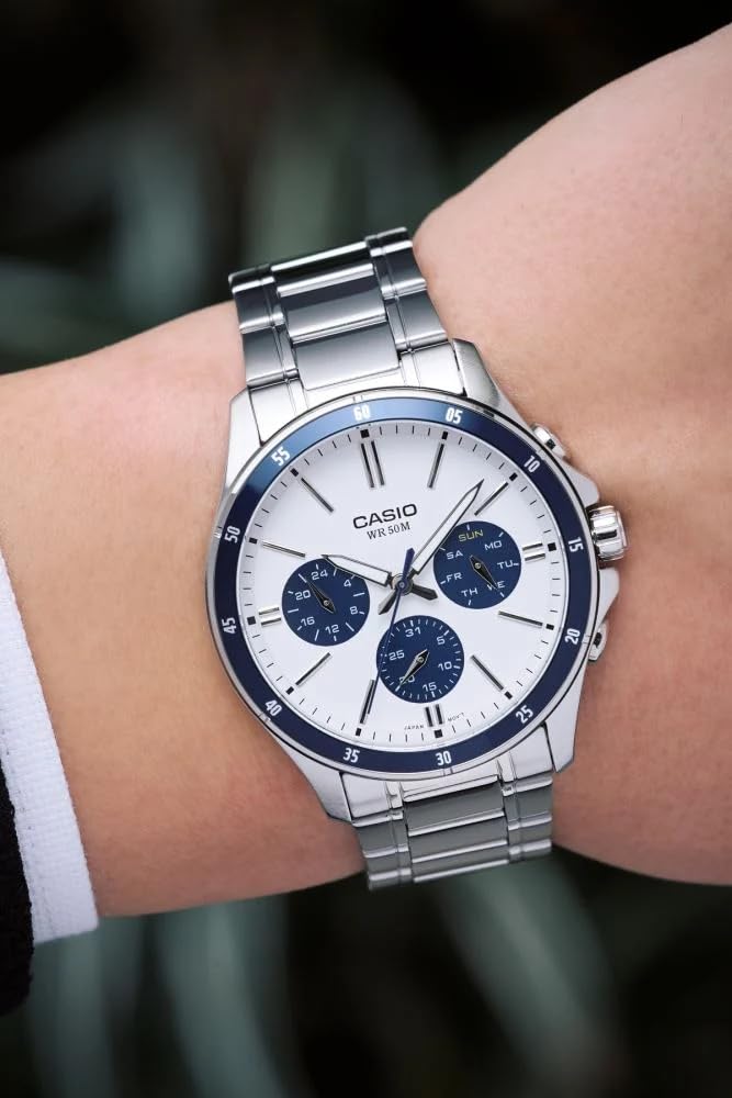 three sub-dials for day, date, and 24-hour time tracking. The design is