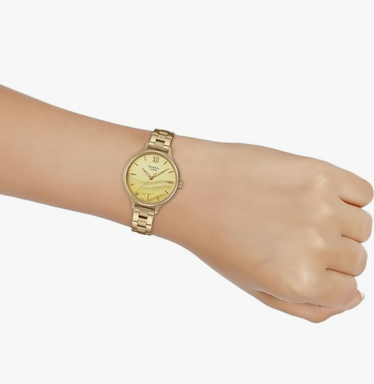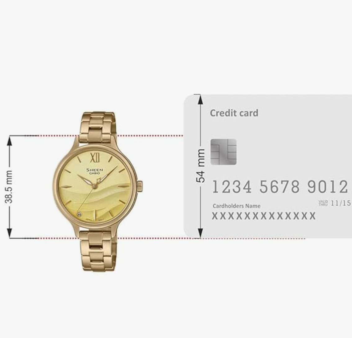 from the Sheen collection by Casio. The round-shaped golden dial of 38.5