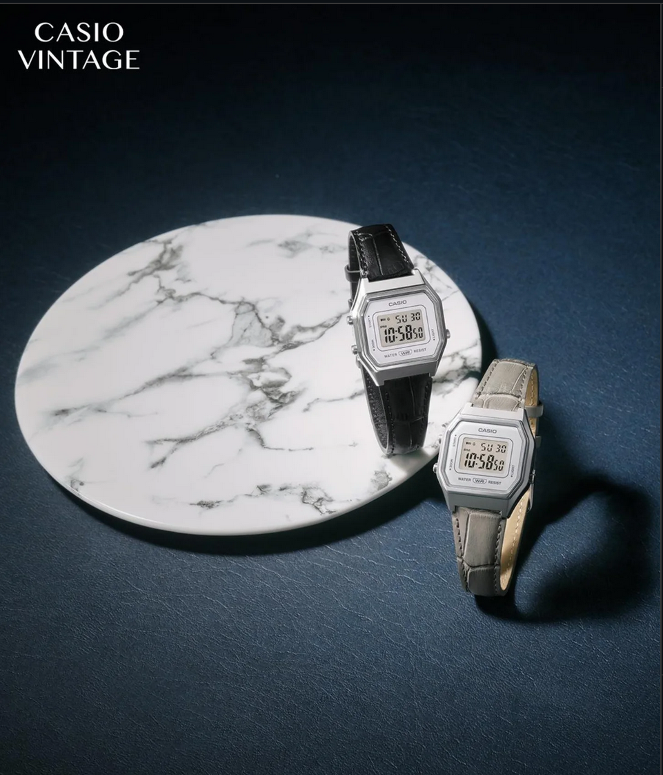 Make a sophisticated statement — the digital LA680WEL with a classic embossed leather band.