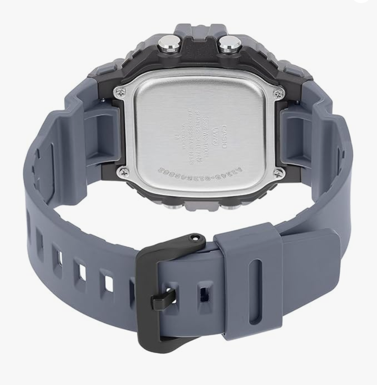 quartz movement. The resin strap is of grey color and the square-shaped