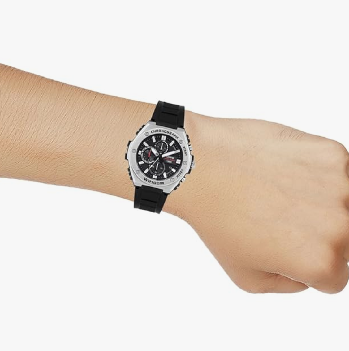 collection by Casio. The black round dial is protected by a resin glass.