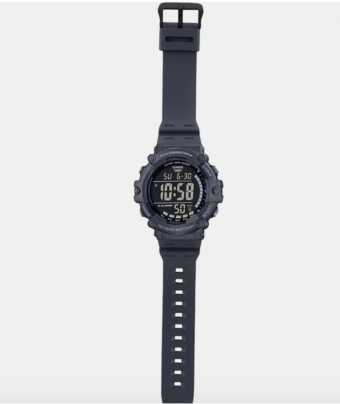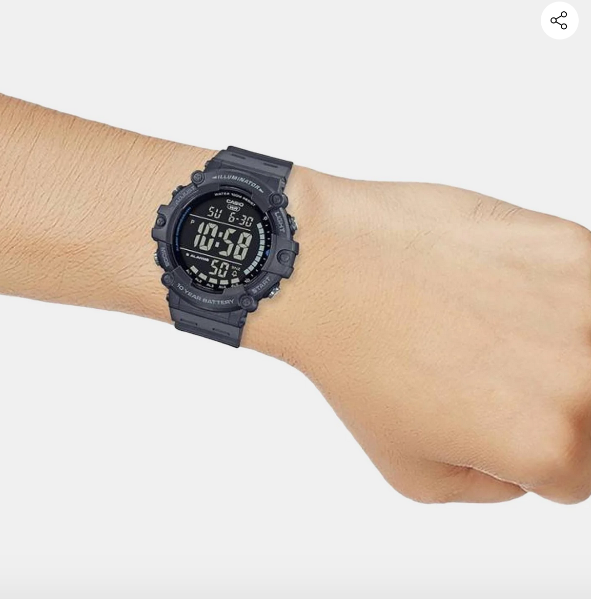 quartz movement, digital display, 10 atm water resistance. A secure
