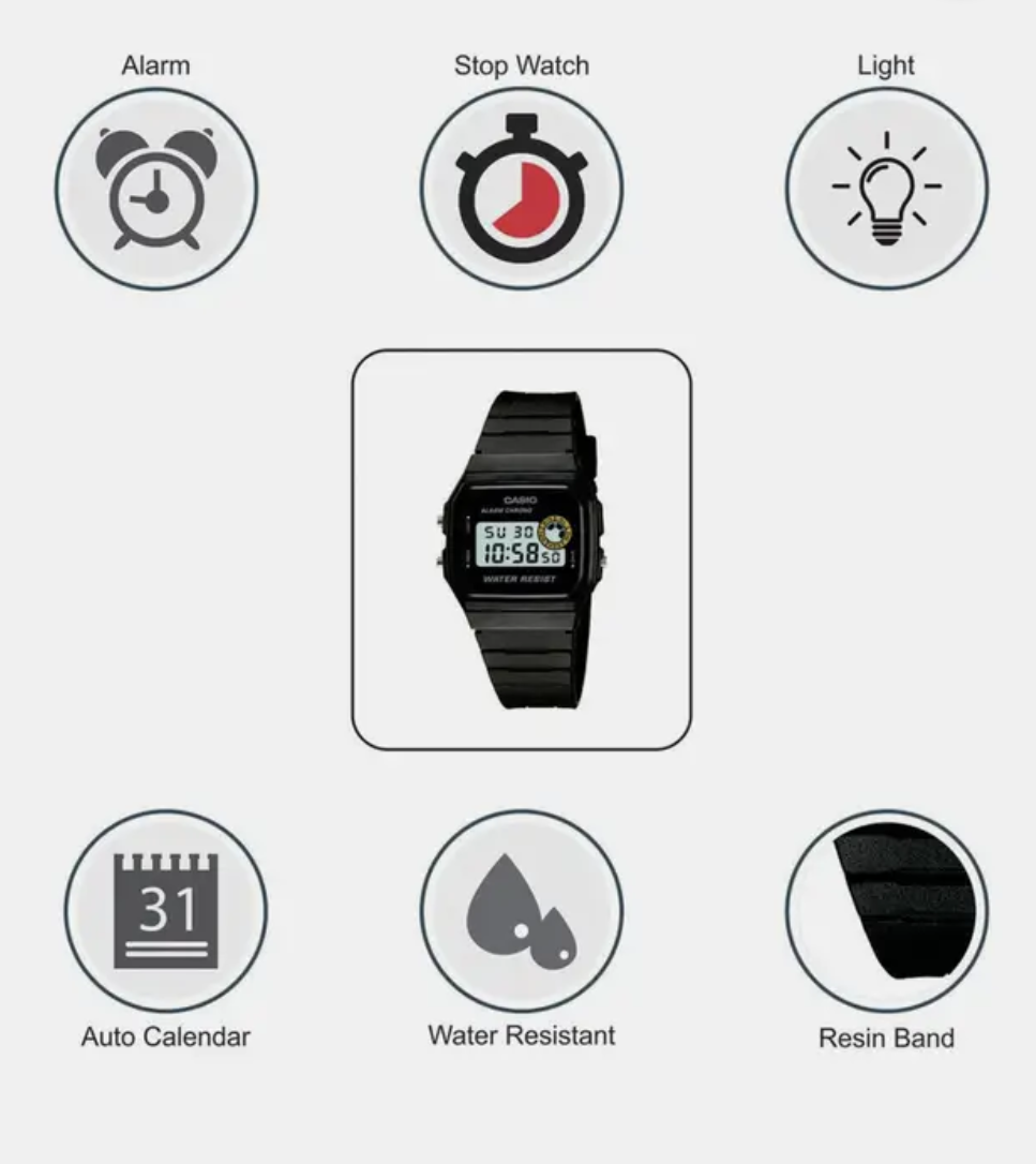features: quartz movement, digital display, 10 atm water resistance. A
