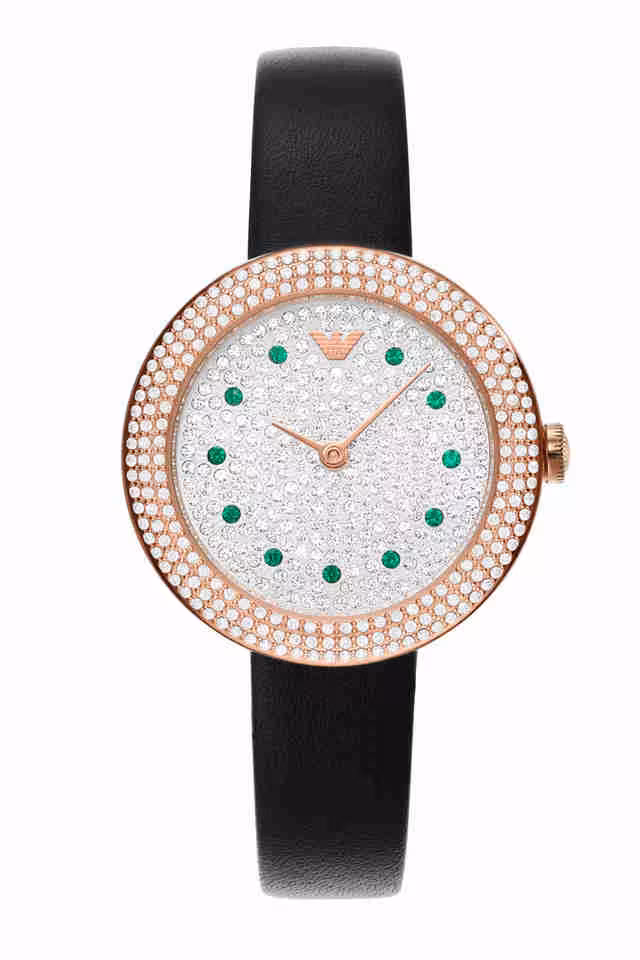 Emporio Armani's 30mm watch features a silver pav? dial, at least 50% recycled rose gold stainless steel case with crystals, two-hand movement and black leather strap with leather sourced from LWG Certified tannery.