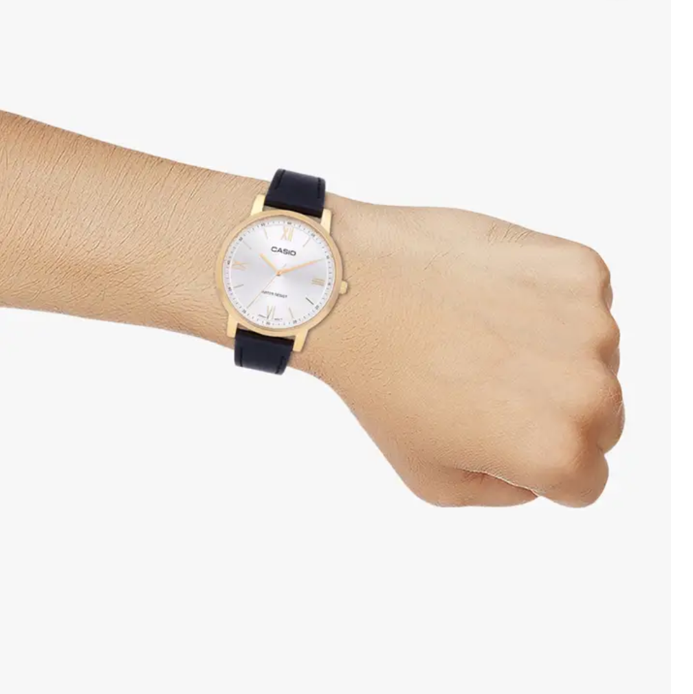 LTP-SN1GL-7A is an elegant women's analog watch by Casio, featuring a stylish leather band and a gold ion-plated case. It’s a perfect combination of sophistication and durability, offering water resistance and a battery life of approximately 3 years.