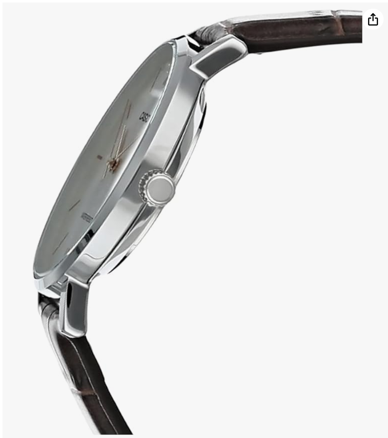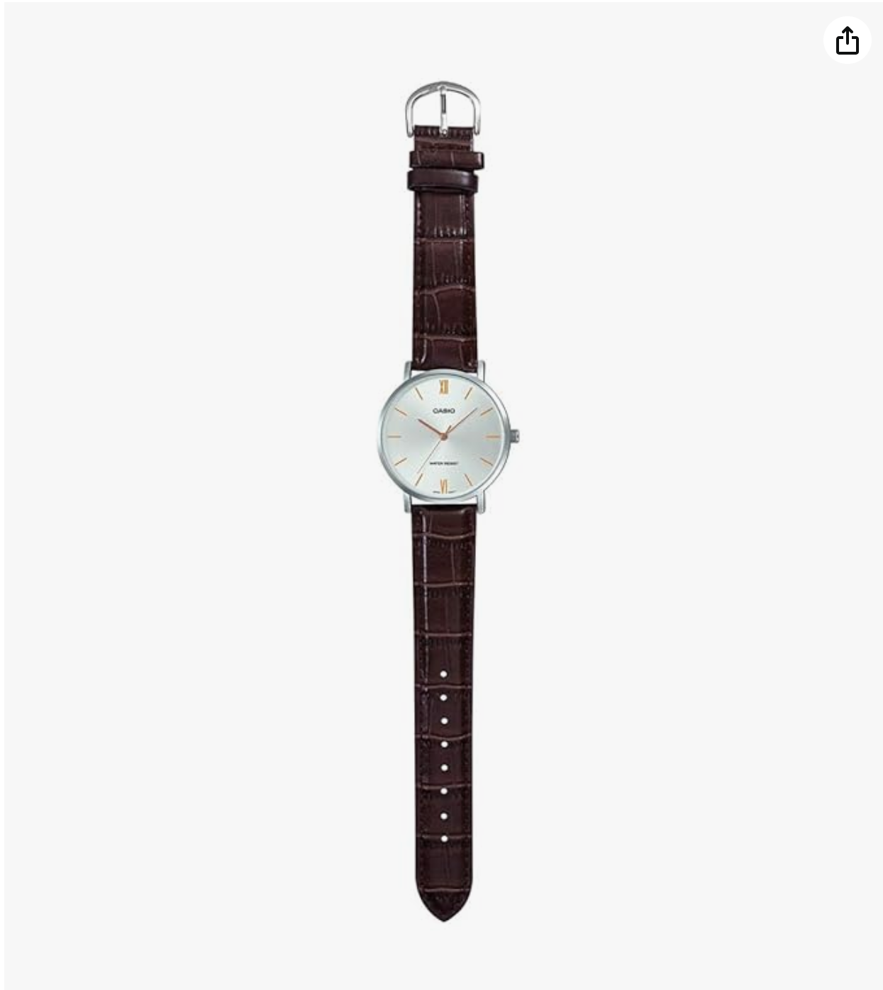 Everyone will appreciate your fine taste in style as you wear this men's analog watch from the Enticer collection by Casio. The silver round dial is functional on a quartz movement. It exudes plain three hands, stick hour markings, Roman numeral hour markings at the 12th and 6th-hour position and a crown for time adjustment. The genuine leather strap vaunts a brown hue that enhances the look of the watch. Furthermore, it is completed with a buckle clasp to ensure a secure fit on the wrist.