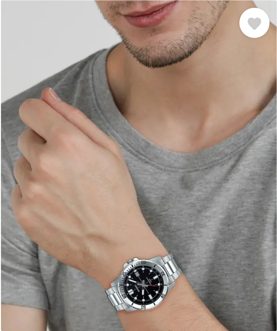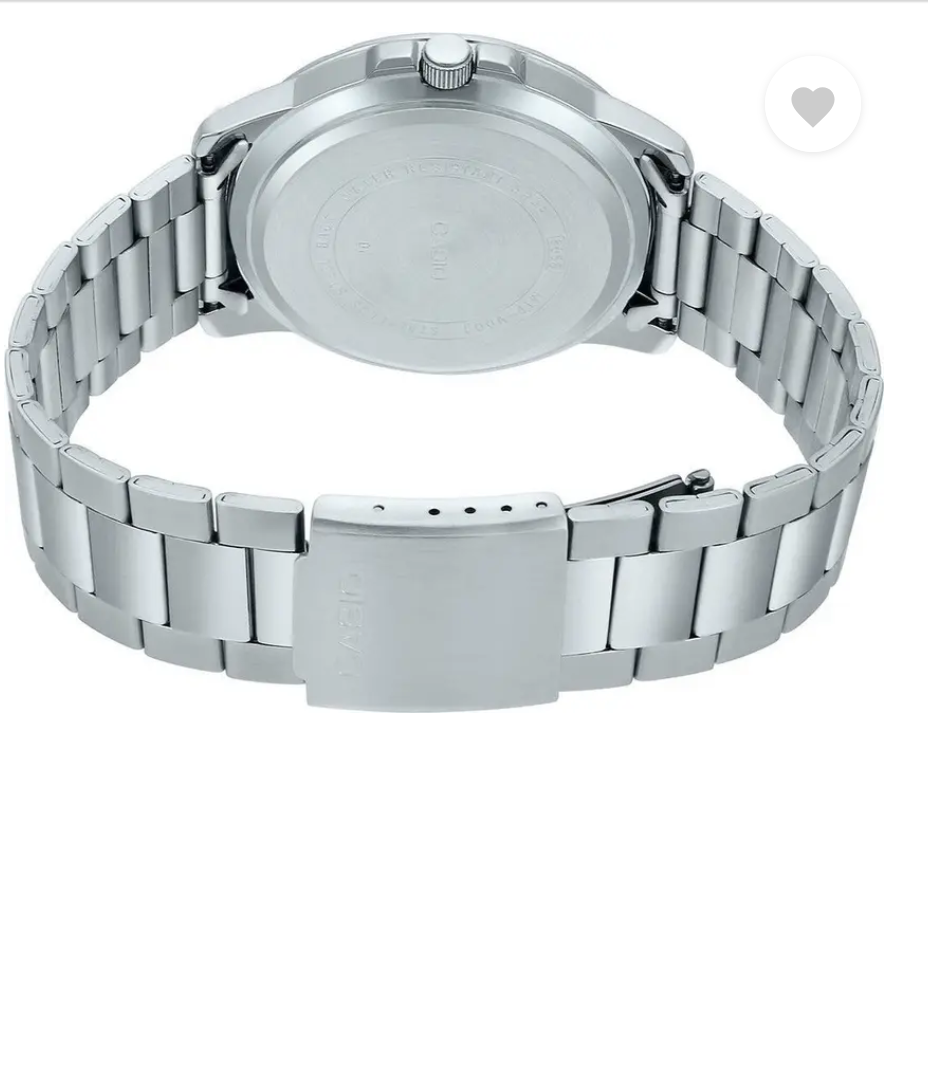 Make a distinct style statement wearing this men's analog watch from the Enticer collection by Casio. Enclosed in a 45 mm case, the black round dial is secured by a mineral glass. It displays plain three hands, hour markings at regular intervals, a date display window at the 3rd-hour position and a numbered bezel. The stainless steel strap vaunts a silver hue that enhances the look of the watch. Besides, it is finished with a fold-over clasp that provides a secure fit on the wrist.