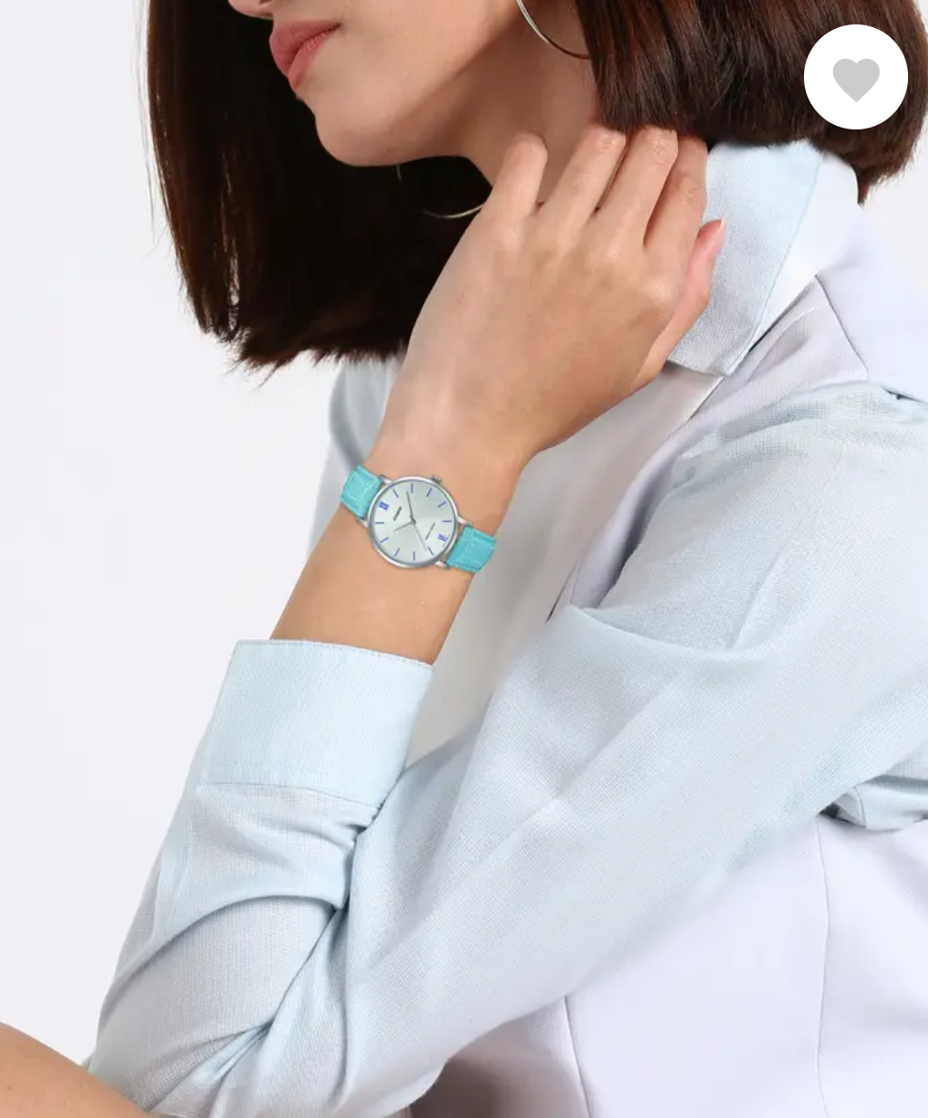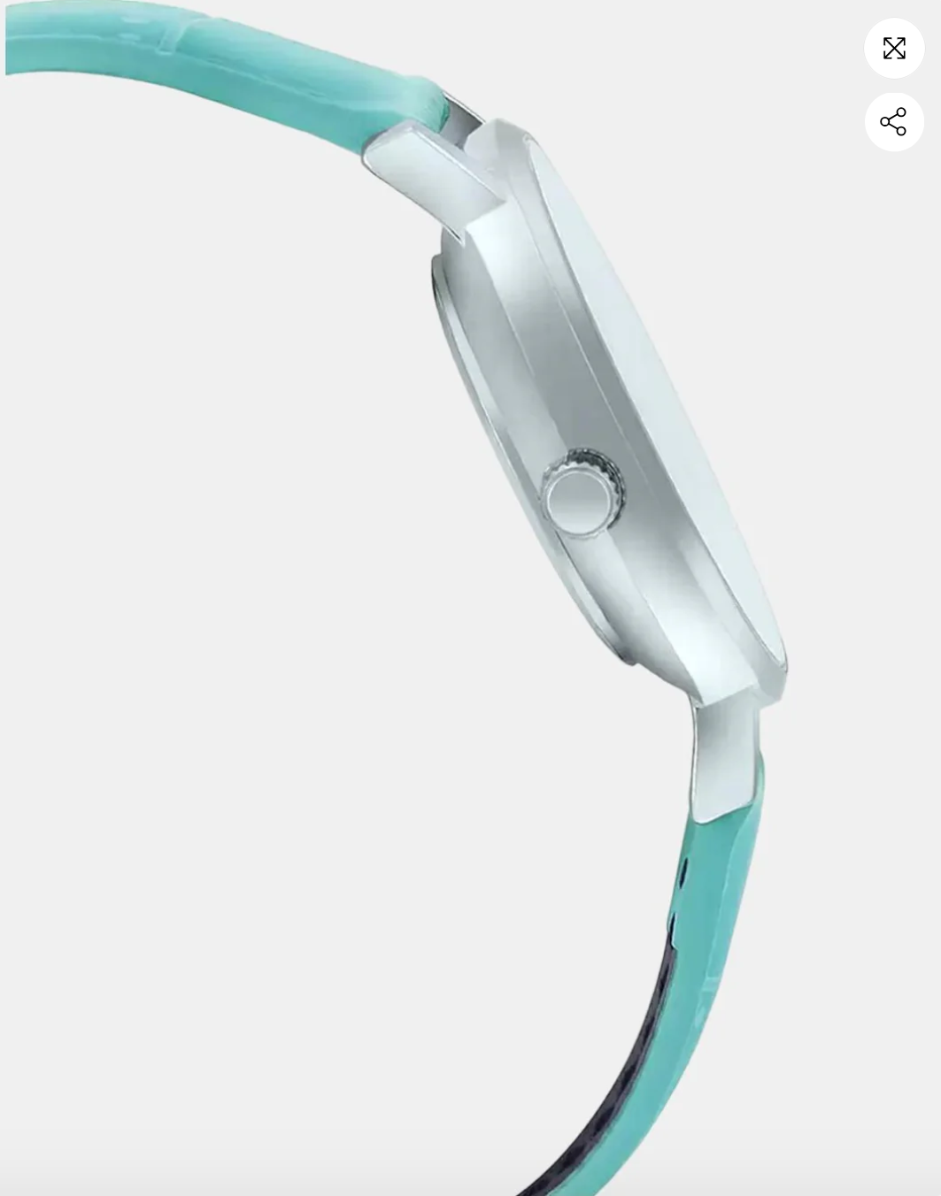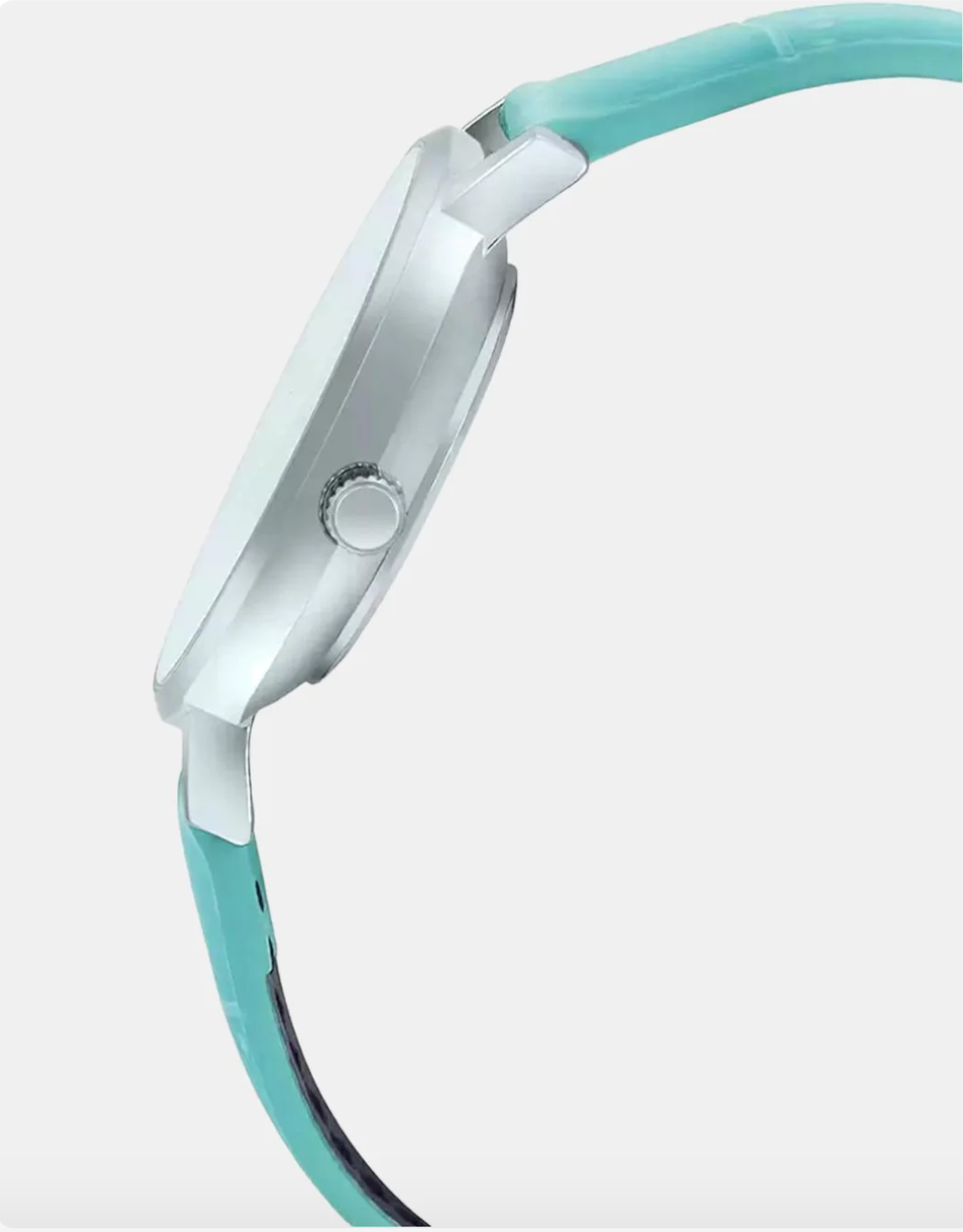 millimeters. The blue colored straps of the watch are made of leather.