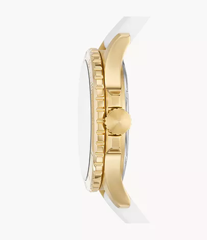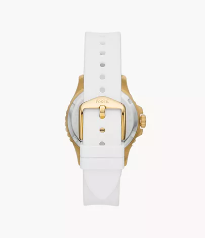 Ready for the season? Yes. A total statement maker? Well, obviously. Our classic, dive-inspired FB-01 watch features a white silicone strap, a gold-tone topring, crystal indices and a light-reflecting silver sunray watch face.