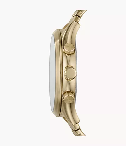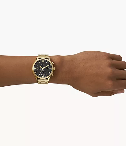This 44mm Fenmore features a black satin dial with Roman numerals at the 6- and 12-hour markers, multifunction movement and a gold-tone stainless steel bracelet.