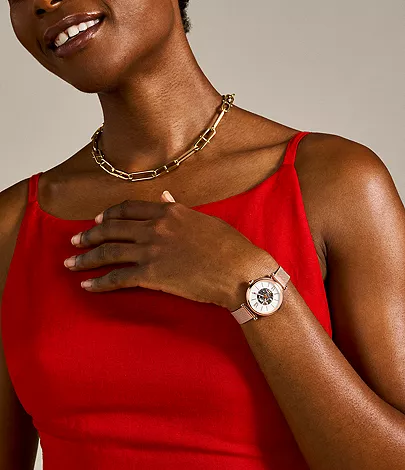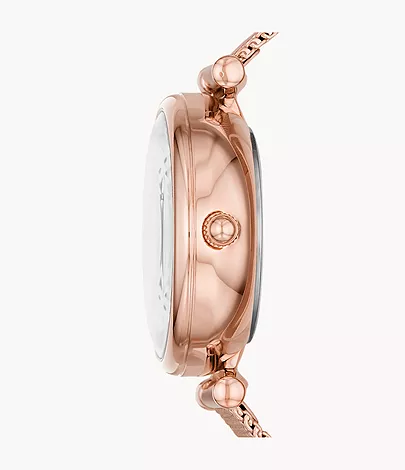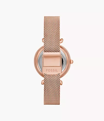 This 28mm Carlie Mini features a white mother-of-pearl dial, automatic movement and a rose gold-tone stainless steel mesh bracelet.