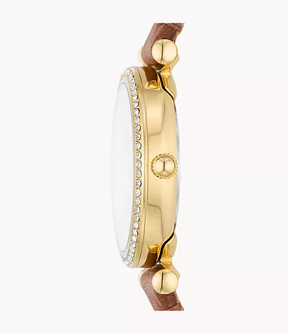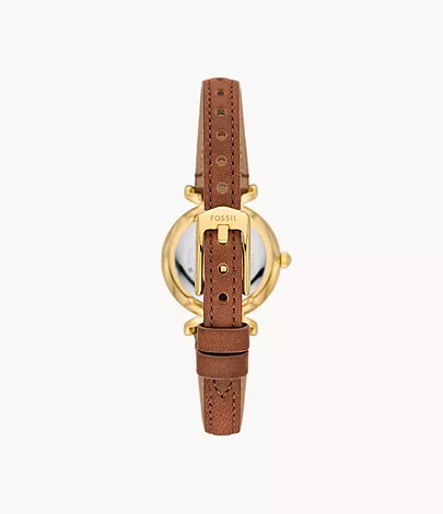 This 28mm Carlie features a silver sunray dial, three-hand movement and medium brown leather strap. Fossil leather products support responsible manufacturing via the Leather Working Group.