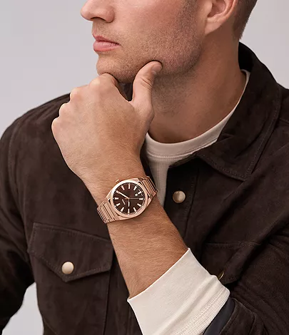 Featuring colours that are on trend for the season, this sporty Everett watch favors the bold with a rose gold-tone stainless steel H-link bracelet and complementary brown sunray dial featuring eye-catching indices.