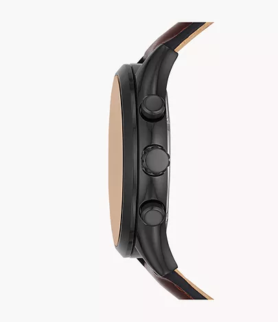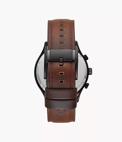 This 44mm Fenmore features a black satin dial with a true amber crystal, multifunction movement and a brown leather strap.