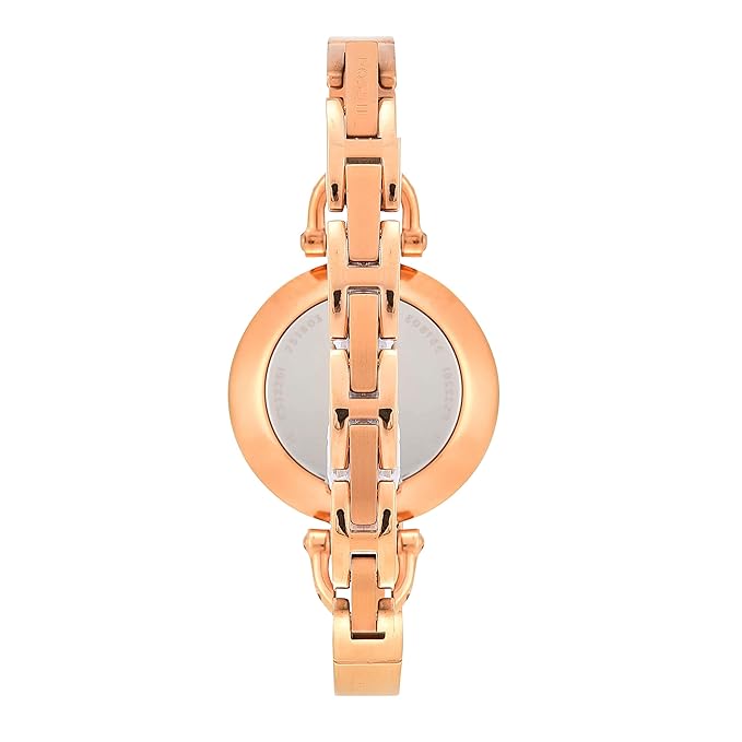 Exciting Feel and Finish A striking fusion of sparkling crystal embellishments and rose gold toned bracelet makes this Fossil Georgia ES3226 watch a style statement in itself. The subtle feeling this watch provides is extremely appealing to any onlooker. Apart from its exciting feel and finish, the ES3227 is also extremely durable and rugged. The band and case of this ES3226 from Fossil are built of stainless steel, making it durable and long lasting. Its strong body also makes it resistant to scratches and abrasions it would encounter over lengthy use. You will love to buy this Fossil stainless steel watch for women and flash it in style the moment you set your eyes on it.Unmistakable Sense of Sophistication and Luxury This Fossil watch for women gives you the unmistakable sense of sophistication and luxury, which makes it stand apart from the crowd. With water resistance up to 50 m, this tough watch can endure accidental water spills. The Fossil rose gold women's watch is also equipped with the Adjust-O-Matic closure feature, which lets you adjust the strap as per your requirement so that you can have a comfortable fit. In case you are looking for a gift to present to that special someone, then the Fossil ES3226 has to be at the top of your list of gift choices. You can gift this Fossil watch to your loved ones on their anniversary, birthday and special occasions and leave an unforgettable and memorable mark on them. Brand: Fossil Collection: Georgia Gender: Women Display: Analog Other Features: Adjust-O-Matic system to self-adjust strap size Case: Stainless Steel Dial Shape: Round Dial Colour: Rose Gold Case Diameter: 32 mm Hands: Three hand movement Markers: Sleek hour markers Strap Type: Stainless Steel Strap Colour: Rose Gold Strap Width: 8 mm Movement: Quartz Water Resistance: Up to 50 Meters