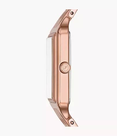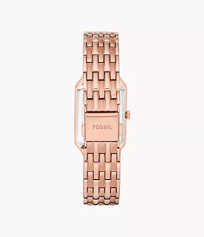 This 23mm Raquel features a white satin dial, three-hand date movement and rose gold-tone stainless steel bracelet.