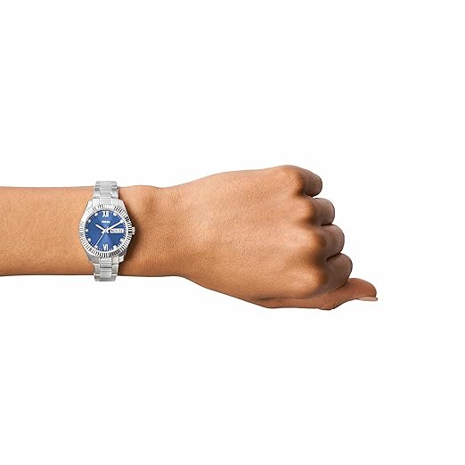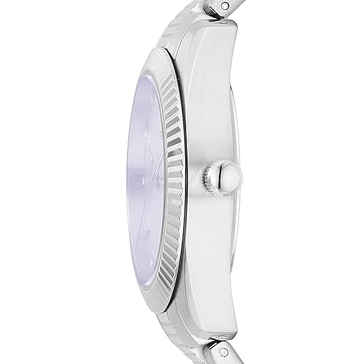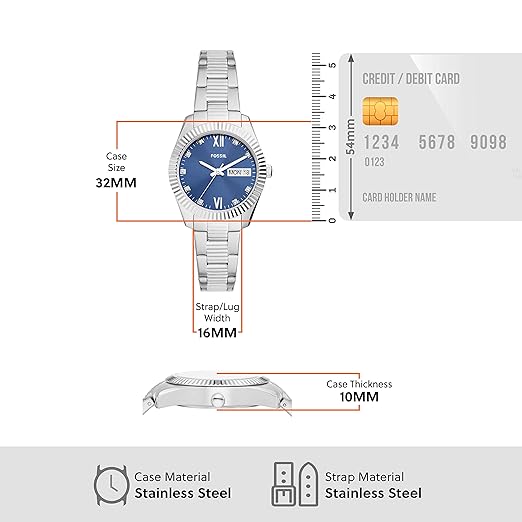 This 32mm Scarlette features a blue sunray dial, three-hand day-date movement and stainless steel bracelet.