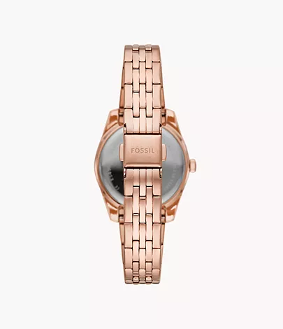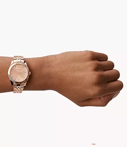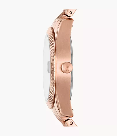 This 32 mm Scarlette Mini features a rose gold sunray dial, three-hand date movement and a rose gold-tone stainless steel bracelet.