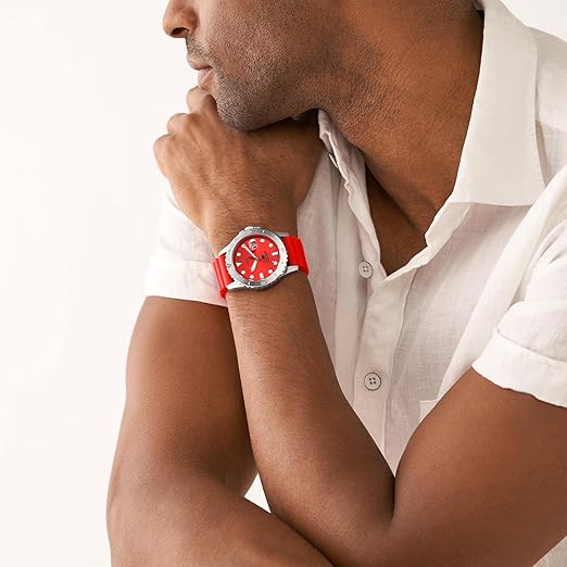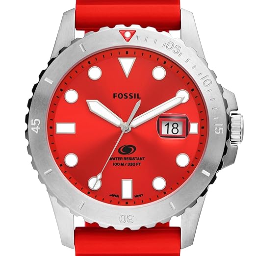 Intentional design details define our time-honored sport watch collection, Fossil Blue. This versatile watch features a swim-ready red silicone strap, matching sunray dial with geometric indices, 100-meter water resistance, a unidirectional rotating topring and a magnifying crystal over the date.