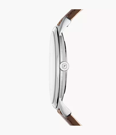 This 44 mm Minimalist features a cream satin dial with stick indices, three-hand movement and a brown leather strap.