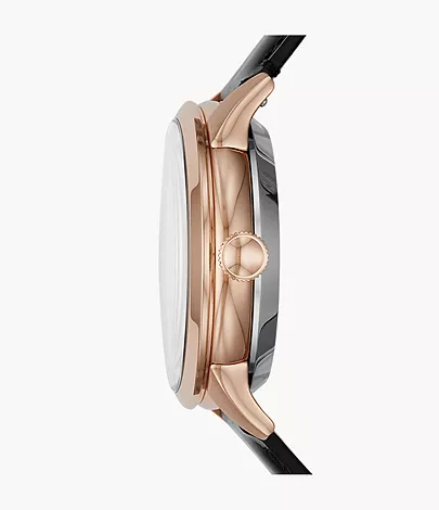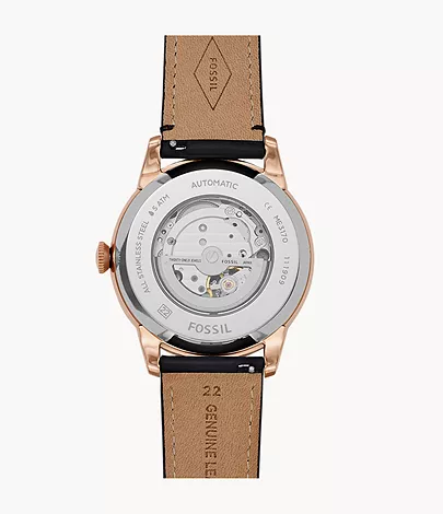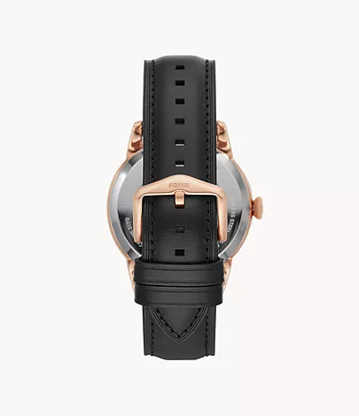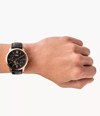 This 44-mm Townsman features a black satin dial with a see-through skeleton sub-eye, automatic movement and a black leather strap.