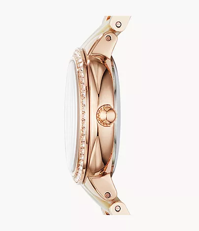 We're revamping the season's classics with clean silhouettes and time-honored materials. Exquisitely crafted in shimmer horn acetate and shiny rose steel, Virginia makes a statement with 86 sparkling multi-colour stones.