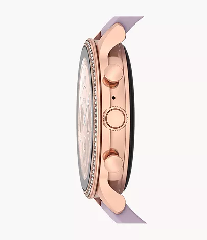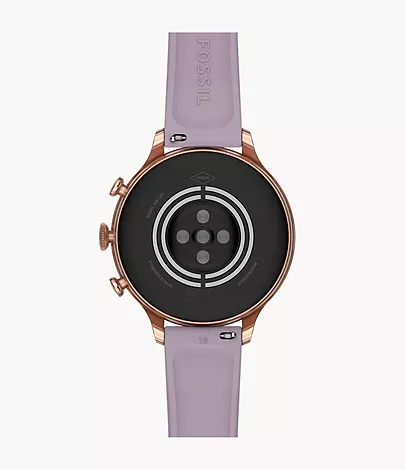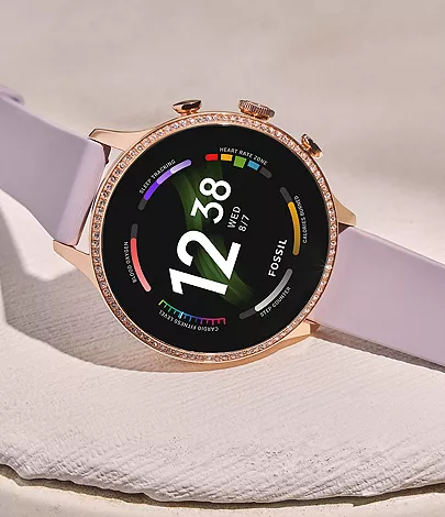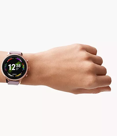 Way more. Way faster. This 42mm Gen 6 touchscreen smartwatch features a purple silicone strap, 2x faster charging speed (80% in a little over 30 minutes), Qualcomm 4100+ technology and tons of personalization options.