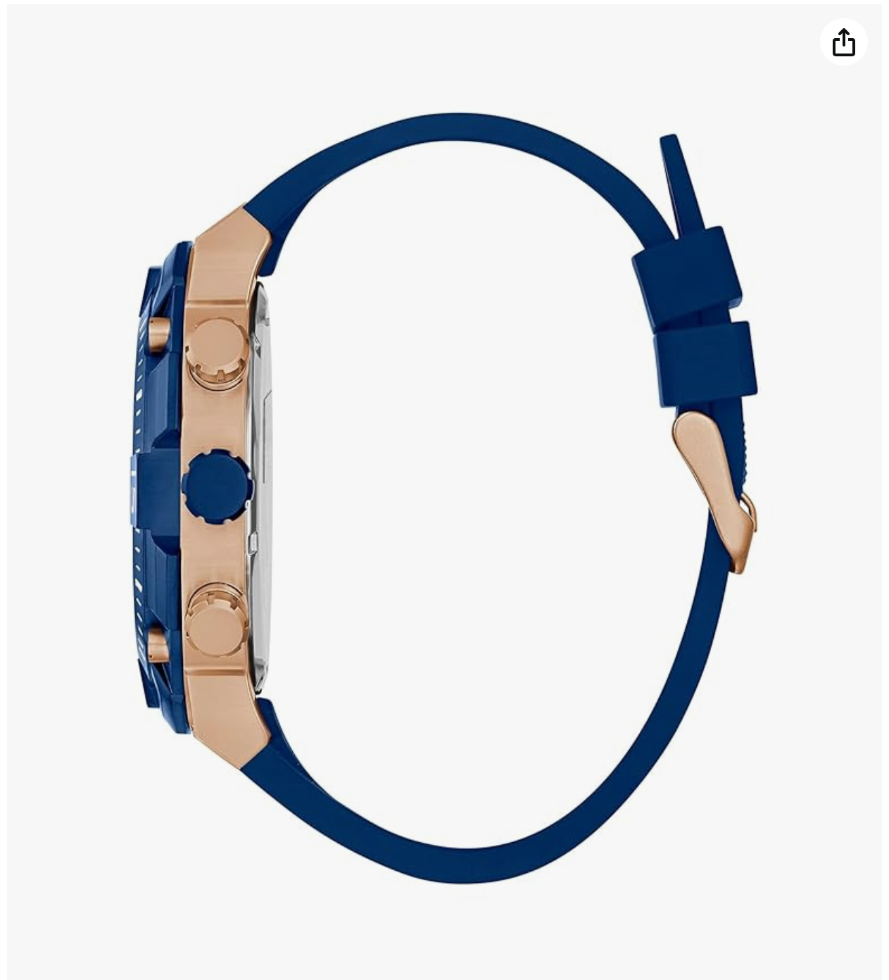 quartz movement. It has a round dial, a buckle clasp and is