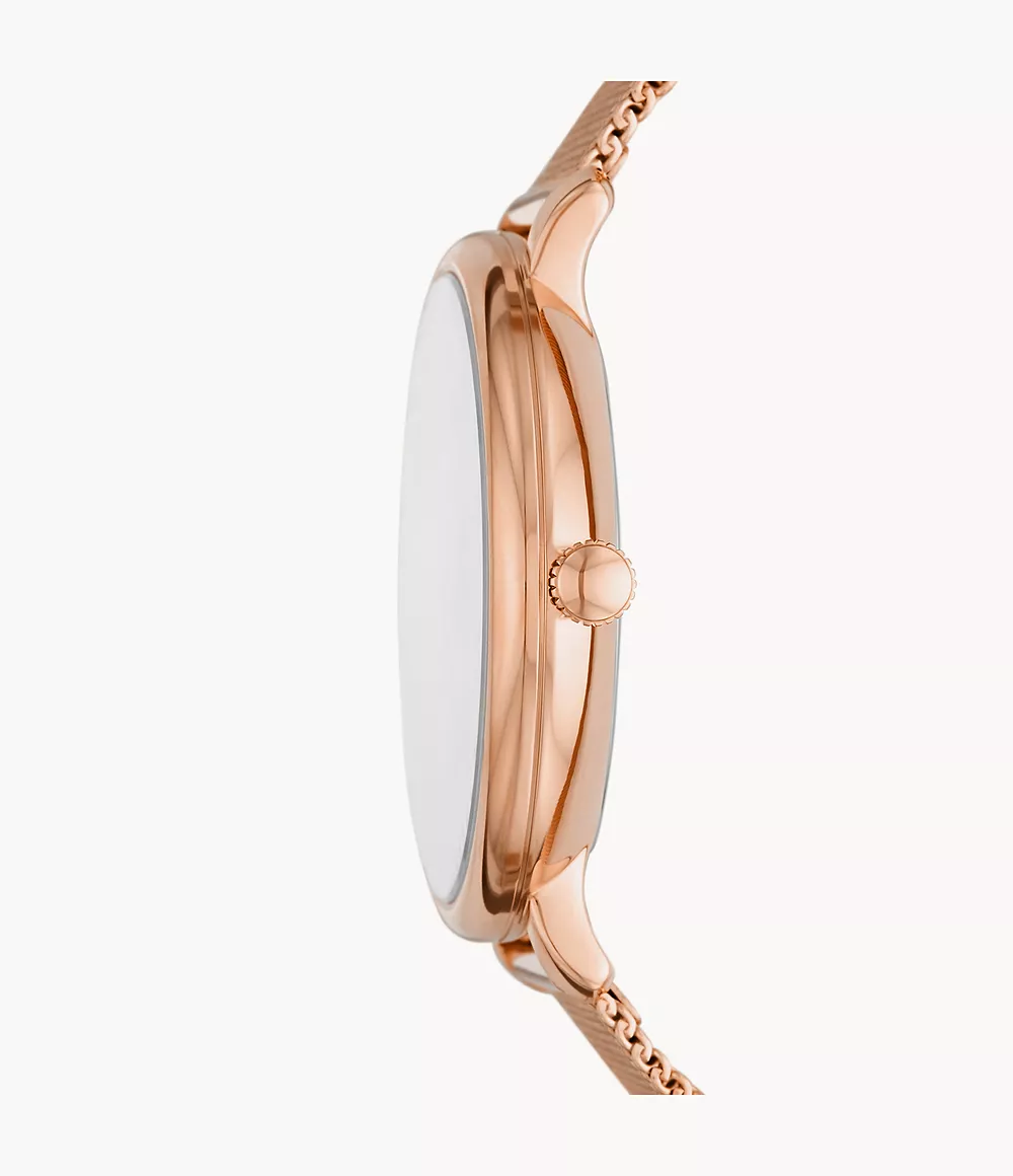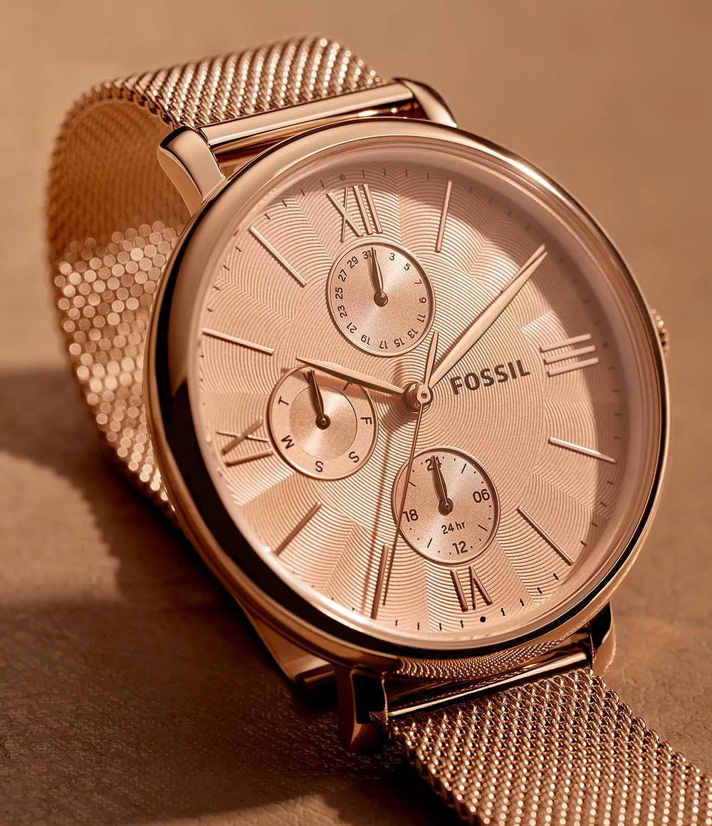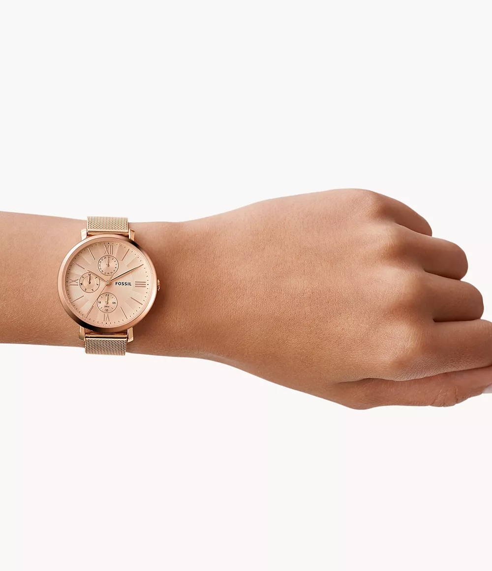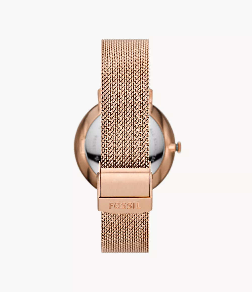 This 38mm Jacqueline features a rose gold cd finish dial, multifunction movement and rose gold-tone stainless steel mesh bracelet.