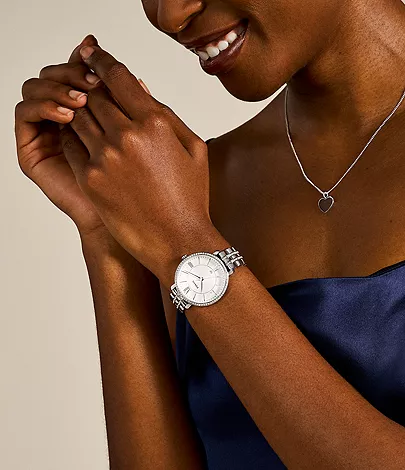 A striking steel bracelet and polished round dial make Jacqueline this season's most irresistible timepiece. With a sparkling crystal topring, this classic watch is set to become her most-worn essential.