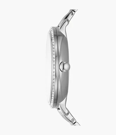 This 36mm Jacqueline features a white mother-of-pearl glossy and textured dial, sun moon multifunction movement and stainless steel bracelet.