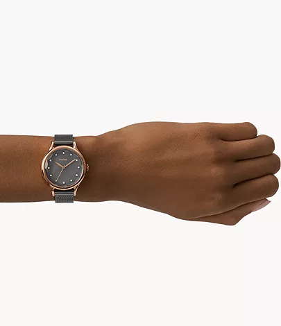 This 34 mm Laney features a mother-of-pearl dial with faceted crystal, three-hand movement and a smoke steel mesh bracelet.