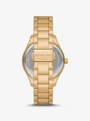 Expertly crafted from gold-tone stainless steel, our Layton watch ensures style and function for years to come. It boasts a faceted topring encircled by pavé accents for a luxe finish, while the contrasting dial features an allover “MK” print that adds a Signature twist. We think it makes the perfect everyday timepiece whether you’re on land or in the air.