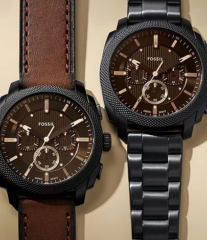 Inspired by classic American machinery, the Machine Chronograph commands attention with its bold knurled topring. Unmistakably masculine with a bold 44 mm case housing a brushed black dial with textured details, all protected by an amber-tinted mineral crystal face. Powered by a precision quartz chronograph movement, this rugged timepiece is built to last with a rich brown leather strap. A true statement in industrial-inspired design.