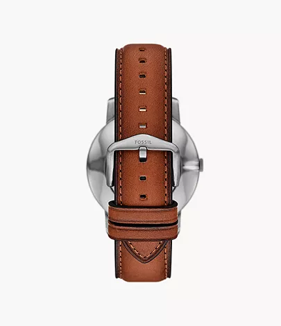 This 44mm Minimalist features a green sunray dial, three-hand movement and brown leather strap. Fossil leather products support responsible manufacturing via the Leather Working Group.