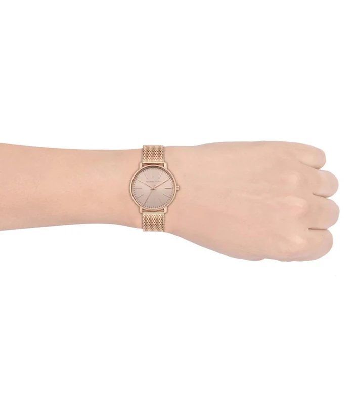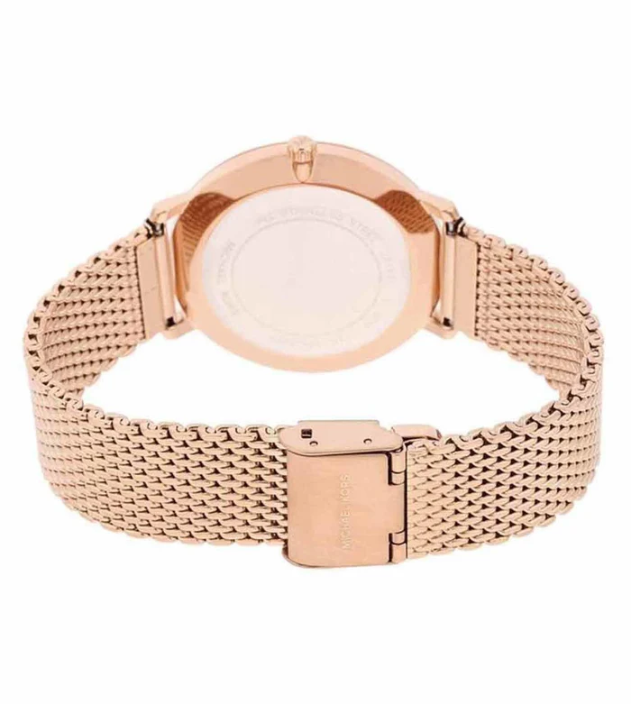 Absolutely eye-catching, this women's analogue watch from the House of MICHAEL Michael Kors which act as the statement piece if you want to give yourself a refined look. A sturdy in timeless glamour, this Pyper collection watch is designed in rose-gold-tone stainless steel and updated with boyfriend inspired round dial, pave studded hour marker and mesh bracelet finishes the look. Wear it as a chic and functional finish to any look. The weight of this piece is 80 gms, the case thickness is 7 mm and the inner circumference is 175+/- 5 mm.