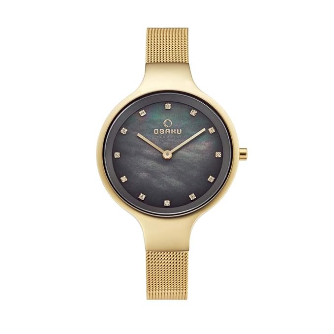 The golden color of this outstanding Obaku watch expresses warmth, love and compassion whether you use it to dress up your casual jeans or wear it with your favorite dress. This minimalist masterpiece comes in a gold plated case fitted with a stunning grey mother of pearl dial and a gold stainless steel mesh bracelet. Clean Scandinavian design principles are at the core of all Obaku designs that are made to look just as contemporary ten years from now as they do today. The case back is engraved with the name of the Danish designer of this watch, Christian Mikkelsen, who is known for his high level of perfection. Go feel the moment!