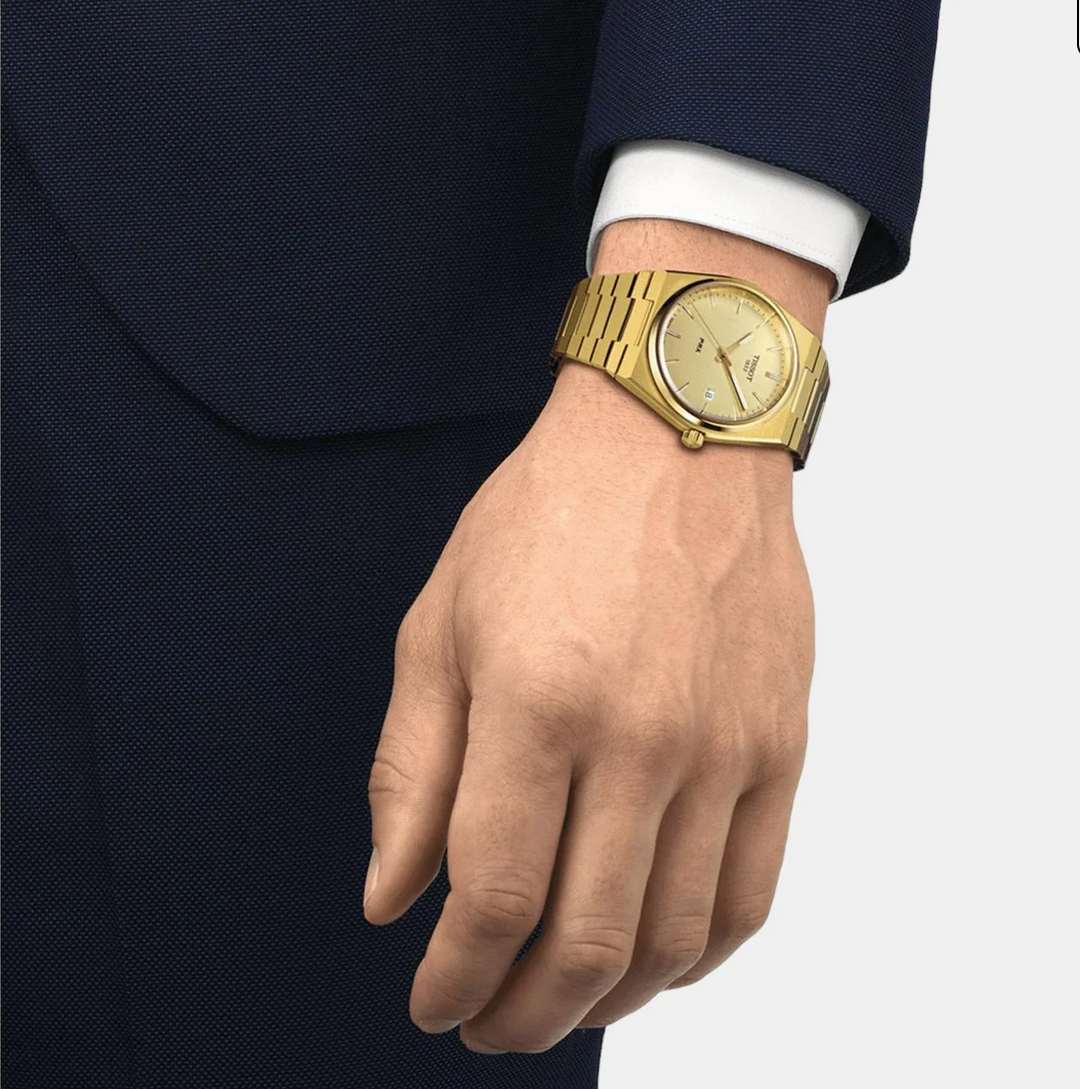 The golden mirror dial creates bold presence while maintaining practical