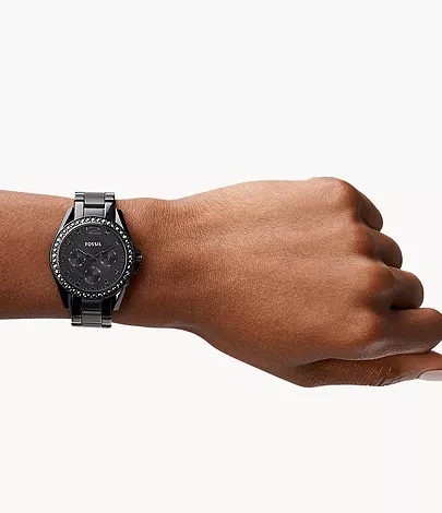 This 38 mm Riley features a black sunray dial with black glitz indices and bezel, multifunction movement and a black stainless steel bracelet.